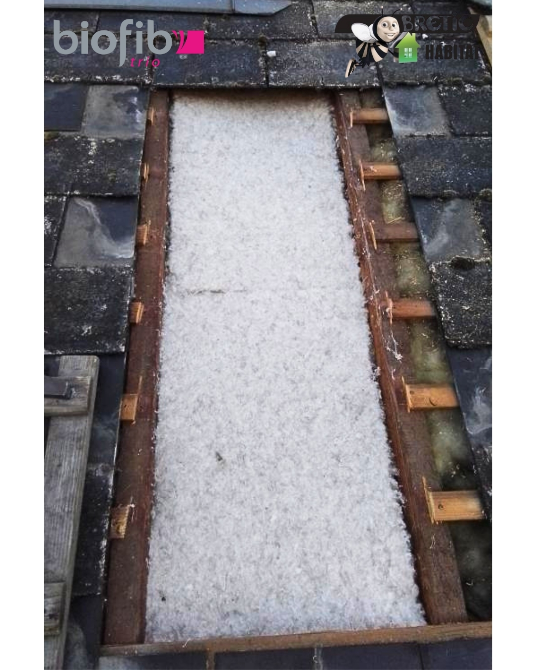 Nous avons retiré l’ancienne laine de verre, devenue vétuste avec le temps, pour la remplacer par un isolant biosourcé de la marque BIOFIB, composé d’un mélange de chanvre, lin et coton.🌿